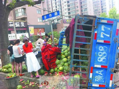 侧翻的西瓜车旁围了很多爱心市民阅读提示