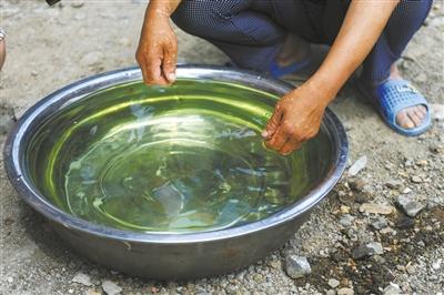 6月24日,辽宁阜新蒙古族自治县那力闪村村民展示刚刚打出的呈绿色的井水。新华社发辽宁省阜新蒙古族自治县境内多处乡村因当地玛瑙染色加工业发展,导致地下水受污染二十多年成“绿茶”,许多村民长期到处“买水”、“借水”,而当地镇政府官员一句“谁污染谁治理”将村民拒之门外。