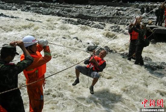 7月13日,四川消防官兵通过搭建绳桥的方式,将被困在国道213线映汶高速公路彻底关隧道附近的一名重伤员以及26名被困者成功转移。目前,受持续强降雨影响,阿坝州汶川境内发生的山洪泥石流、滑坡、塌方等灾害救援仍在持续中。图为消防官兵空中绳桥转移被困民众。中新社发 蒲建勇 摄 中新网7月15日电 综合消息,今年入汛以来,中国多地持续遭受暴雨袭击,部分地区发生山洪、泥石流、滑坡等灾害,造成重大人员伤亡和财产损失。未来三天,包括北京在内的华北、东北等地将出现一次明显的降雨天气过程,且局地伴有短时雷雨大风等强对流天气。而四川盆地的降雨也会逐渐展开,且呈缓慢增强趋势。