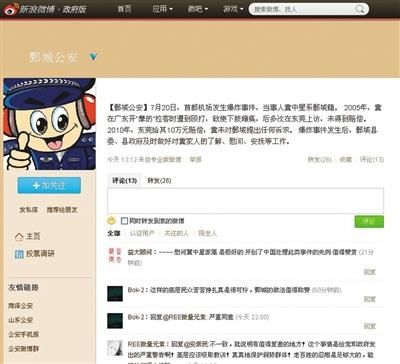 21日,鄄城县公安局通报称,事件发生后对疑犯家人进行安抚。(网络截图)20日晚18时24分,一残疾男子在北京首都机场T3航站楼B出口外引爆自制炸药,经确认,该男子为山东菏泽人冀中星。昨日(7月21日),北京警方确认已对嫌疑人冀中星正式刑拘。