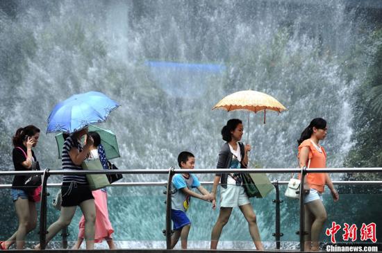 8月6日,重庆市民经过喷泉纳凉。陈超 摄 中新网8月6日电 6日,南方高温达到今年以来最鼎盛。中央气象台监测资料显示,中国18个省区市6日出现高温天气,35℃以上的高温面积约158万平方公里,40℃以上约7万平方公里。而据中央气象台预计,高温7日或再加强。