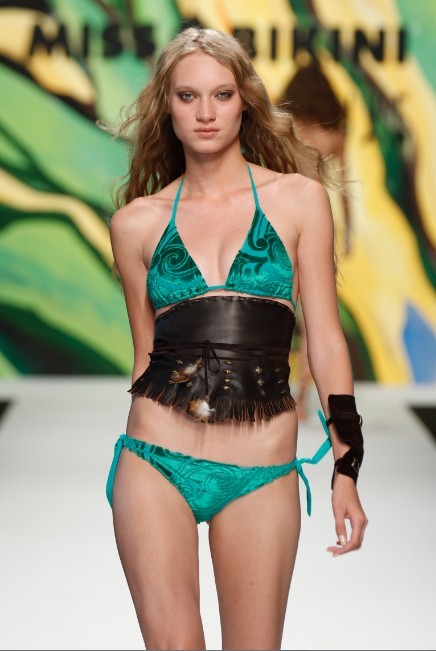 Miss Bikini 本季最新推出的亚马逊风格比基尼使女性看起来更加性感、灵动。面料上绘有纹身、花卉图案,搭配以手链、腰带和皮项圈,增强 本季主推的丛林气息。