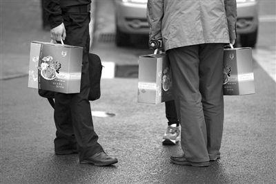 昨日,晚高峰,CBD几名上班族手提中秋节礼盒,站在路边。新京报记者 侯少卿 摄中纪委近期发出通知,要求坚决刹住中秋、国庆两节送礼吃喝风,并公布举报电话。从“八项规定”到整治“四风”,中央出台一系列整肃作风之举。