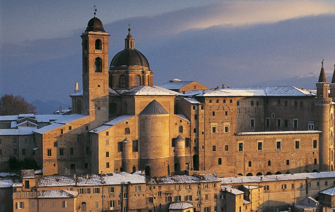 马尔凯地区的乌尔比诺古城镇,被联合国教科文组织列为世界文化遗址,公爵宫是意大利文艺复兴时期建筑和艺术的代表之作。
