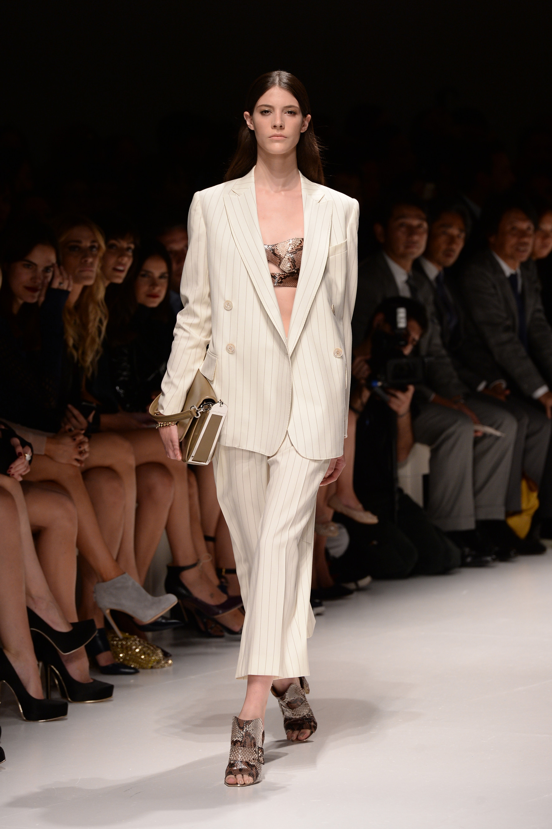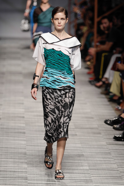 Missoni 2014春夏女装秀围绕着海洋、土地、火焰、空气这4大元素展开,设计师以大海主题开场,。起飞的海鸟印花可以看做是Missoni招牌V字印花的变形,搭配漫画感觉的海水印花,给人宽广自由之感。逍遥自在、摩登性感还透着异域风情!菲拉格慕设计师Massimiliano Giornetti本季以解构西装彰显睿智一面,露出腰部的上衣轮廓诠释女性性感。打破往季华丽风格约束,简约直白线条将质朴基础色与皮革面料融合。乳白色、米色、卡其色中点缀蟒蛇纹元素。