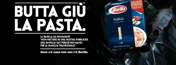 意大利最著名的面食生产厂家Barilla的老板Guido Barilla日前表示,“我们的广告里绝不会出现同性恋家庭,因为我们所认为的家庭是传统的那种。”于是网上出现了各种抵制Barilla的热潮。。若真如此,对于一部分人,那句广告词"Dove c'e' Barilla, c'e' casa.(哪里有Barilla意粉,哪里就有家)"还有什么意义呢?