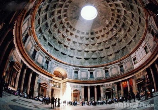 万神殿唯一的光源万神殿(Pantheon)是至今完整保存的唯一一座罗马帝国时期建筑,始建于公元前27-25年,由罗马帝国首任皇帝屋大维的女婿阿格里帕建造,用以供奉奥林匹亚山上诸神,可谓奥古斯都时期的经典建筑,被米开朗基罗赞叹为“天使的设计”。公元80年的火灾,使万神殿的大部分被毁,仅余一长方形的柱廊,有12.5米高的花岗岩石柱16根,这一部分被作为后来重建的万神殿的门廊,门廊顶上刻有初建时期的纪念性文字,从门廊正面的八根巨大圆柱仍可看出万神殿最初的建筑规模。