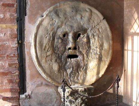 在意大利罗马,面对埃曼纽尔二世纪念堂,沿右手边的马赛洛剧场大街走大约15分钟,就到了科斯美汀圣母教堂(Santa Maria in Cosmedian),这个教堂很小很安静,但里面却有名扬世界的“真理之口”。这是一块雕刻着海神头像的圆盘,据说把手放在他的嘴里,如果说谎就没办法拔出来。在《罗马假日》里,就是它吓坏了可爱的公主。其实这是一只古罗马时代的井盖,1632年在教堂外墙边发现的。教堂本身的建筑是在6世纪兴建,以柯林特圆柱和拜占庭风格的镶嵌画为装饰,也很值得一看。教堂前还残留着罗马现存最古老的神殿方特纳神殿的遗迹。
