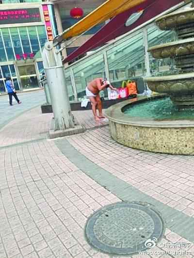 新浪微博@诗诗雨同学:有个汉子在happy站台旁边那个小喷泉洗澡,洗发水沐浴露都带齐了,目测应该不会脱光。