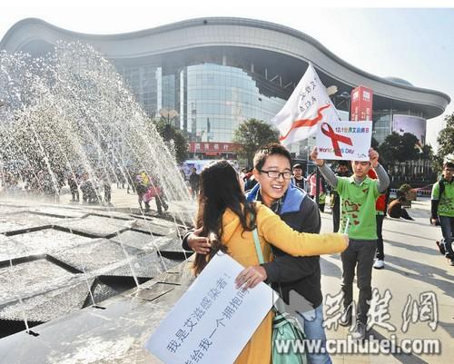 武汉市民热情拥抱小李“我是艾滋感染者,能给我一个拥抱吗?”昨日是世界艾滋病日,上午10时在光谷步行街,一个手举牌子的小伙格外引人注目。近半小时后,一位年轻的妈妈上前深深地拥抱了他,并鼓励他坚强乐观的走下去。