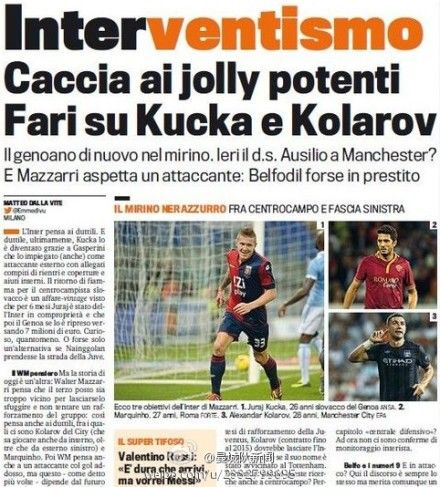 《米兰体育报》的消息,国米有意打包引进曼城中锋哲科和左边卫科拉罗夫