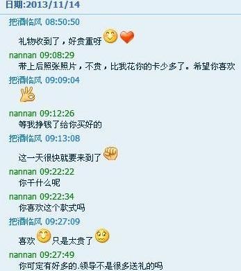 另11月14日的聊天记录则显示,“nannan”送了一条领带给男方,“把酒临风”觉得贵重,“nannan”则说:“不贵,比我花你的卡少多了。”之后,“把酒临风”戴上领带照了一张照片发给对方。
