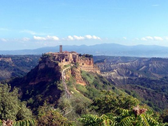 我在一年中最和煦的日子来到这里,从罗马乘大巴车一路向北,两个小时就到了巴尼奥雷焦。穿过小镇,绕下一段依山而建的台阶,放眼望去,我们所有人都忍不住“哇”了出来。眼前的画面用什么语言描绘大概都会显得苍白:周围是低洼的河谷,天空之城就孤傲地矗立在几百米外的山头上,突兀而险峻。建在悬崖之畔的房子看似危卵,不知已在陷落之虞中惴惴了几千几百年。