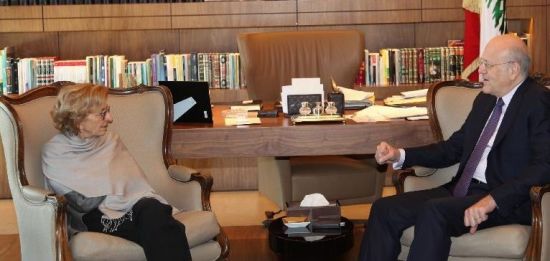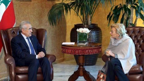 2月5日,在黎巴嫩贝鲁特,黎巴嫩总统苏莱曼(左)会见到访的意大利外交部长埃玛·博尼诺。正在黎巴嫩访问的意大利外长埃玛·博尼诺5日在贝鲁特指出,叙利亚问题第二次日内瓦会谈漫长而复杂,应当优先解决叙利亚面临的人道主义问题。新华社发