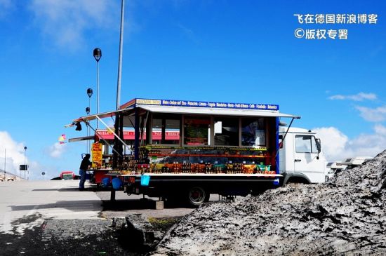 旅游巴士和私家车都需要停在位于2500米左右的游客落脚点。这里有一个很大的停车场。图中方形小楼是出售山顶缆车车票的地方,身后的缆车通往最高的火山口。