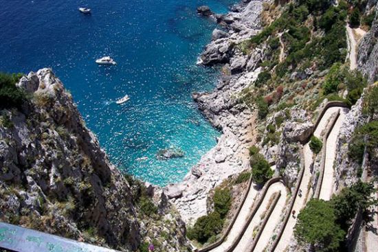 卡普里岛上有两个镇:卡普里和阿纳卡普里。两镇中国有一堵陡峻的峭壁,古代腓尼基人在悬崖上开凿了777级台阶,游人至今仍可以拾级而上。但由于台阶过多难于攀登,人们清寒是愿意乘坐只有半节火车车厢长的公共汽车, 沿着悬崖峭壁上开凿修建的公路上去。