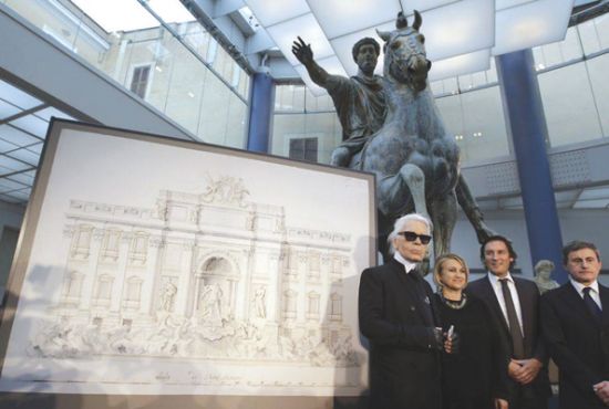 图片说明:芬迪承诺捐资修复罗马特雷维喷泉。作为回报,意政府同意该品牌在巴黎时装发布会上使用特雷维喷泉作为主题奢侈品牌“托德斯”老板出钱修复斗兽场,并获15年以上张贴标识权—— “意大利先生”巨款救古迹遭质疑