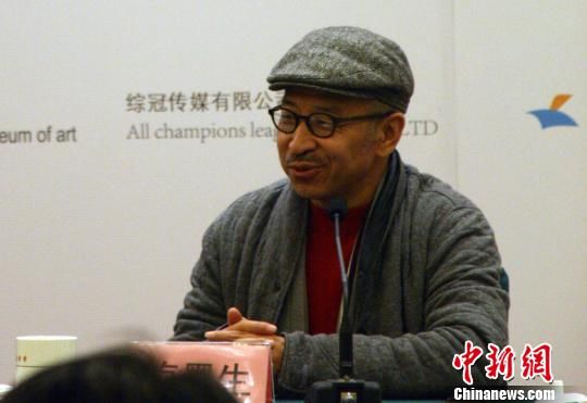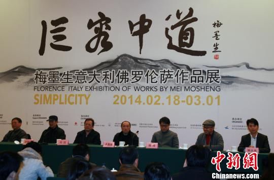 中国著名书画家梅墨生在16日的新闻发布会现场。木易摄中国著名书画家梅墨生将于2014年2月18日—3月1日期间在意大利佛罗伦萨圣十字殿堂举办“从容中道—梅墨生意大利佛罗伦萨作品展”,展示中国画静雅空灵的神韵与内涵。