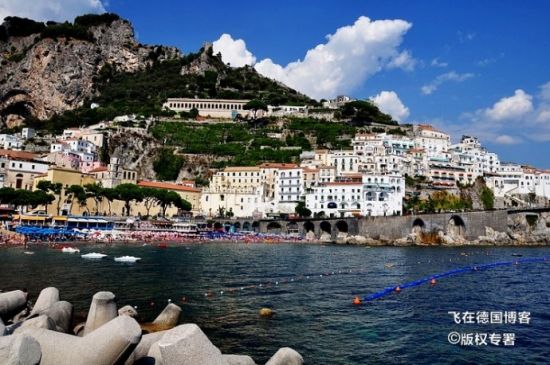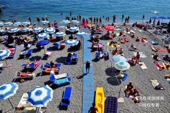 从山上穿过民居慢慢下来,就是阿玛尔菲镇的海滩了。其实确切点应该是细石滩,这里火山岩的地质构造很少有细沙滩的。人们晒的不亦乐乎。从沙滩上的人流可以看出这里真是个大城镇。