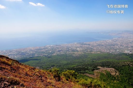 高空俯瞰维苏威火山,是一个美丽的圆弧火山口,这正是那次庞贝火山大喷发留下来的。由于火山一直很活跃,植被一直没有长出,看着光秃秃的。偶尔有些小花小草。火口深约一百多米,由黄、红褐色的固结熔岩和火山渣组成。