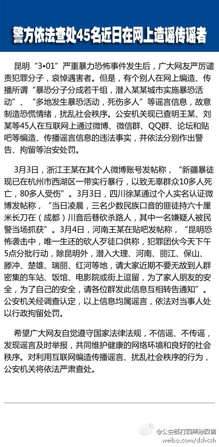 昆明暴恐案后警方依法查处45名网上造谣传谣者