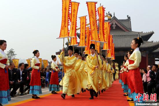 4月4日上午,第23届洪洞大槐树文化节寻根祭祖大典启幕,来自海内外的上万名古槐移民后裔在有“天下故乡、华人老家”之称的山西洪洞县寻根祭祖园,同拜移民先祖。中新社发