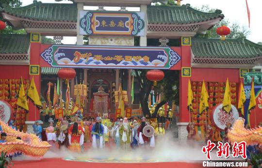 2014茶山“茶园游会”开幕,图为开幕式上众仙祈福场景。 安致标 摄中新网东莞4月24日电(李映民 安致标 李纯)“梦从茶山起,福自东岳来”——2014茶山“茶园游会”24日在广东东莞茶山镇开幕。今年正值“茶园游会”500周年,为了重现古时“茶园游会”盛况,此次大巡游汇聚了祈福、粤曲、婚俗等方阵,生动再现中国传统民俗。