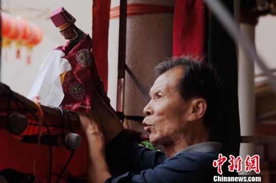 30日,“第七届泉州民间布袋戏邀请赛”在泉州继续上演,68岁的黄师傅正专心表演布袋戏。 陈龙山 摄中新网泉州4月30日电 (陈龙山 廖静 李晓桐)30日,“第七届泉州民间布袋戏邀请赛”进行第二轮表演阶段,期望让外地游客和返乡的海内外乡亲欣赏到福建泉州的乡土风情。