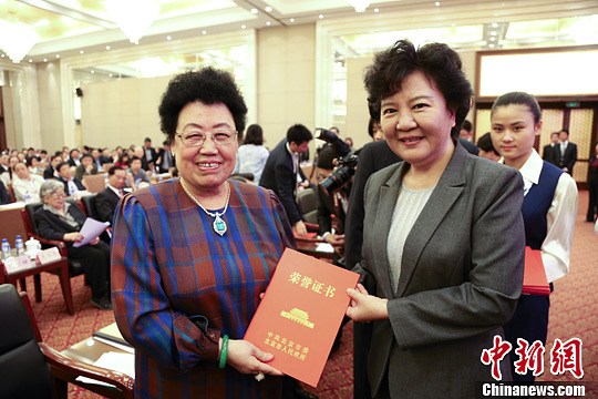 图为国务院侨办主任裘援平为获得“京华奖”的富华国际集团主席陈丽华颁奖。中新社发 钟欣 摄中新社北京5月8日电 (记者 娄晓)北京市侨务工作会议暨首届“京华奖”颁奖大会8日在北京举行。