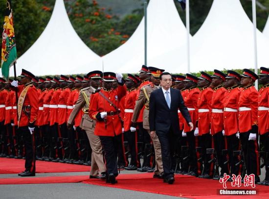 5月10日,中国国务院总理李克强在肯尼亚总统府广场出席肯总统肯雅塔举行的欢迎仪式。中新社发 刘震 摄 中新社北京5月12日电 (记者 高凯 郭金超)中国国务院总理李克强访问肯尼亚期间,中肯签署了关于蒙巴萨-内罗毕铁路相关合作协议。观察人士分析,此番拿下东非铁路大单,是中国官方带动中国经济外向型发展,促中国经济转型之重要手笔。