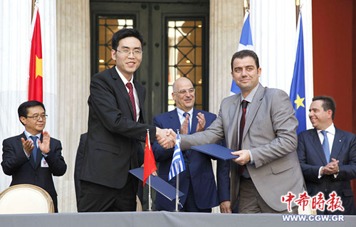 希腊“迈萨维诺”橄榄油1千万欧元长期合作协议成功签约中国侨网6月24日电 据希腊《中希时报》报道,中国国务院总理李克强6月19日起对希腊进行了为期三天的正式友好访问。19日下午,中国-希腊企业商务协议签字仪式在雅典扎皮宫举行。中国国家发改委主任徐绍史、商务部长高虎城,希腊海运部长瓦尔斯奥蒂斯和发展部长邓迪亚斯等到场见证。当天共签订了19个商贸协定,总金额超过48亿美元。而在这芸芸商界精英之中,出现了一位为希腊侨界所熟悉的面孔,他就是曾经在雅典居住了近10年的年轻“老”华侨韩飞。