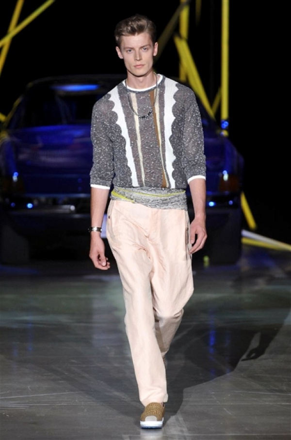 本届男装展最终压轴的是著名品牌Roberto Cavalli。为设计本季新款,佛罗伦萨设计师重温了其青年时期的作品。他将自己的第一辆车的模型停放在T台之上,模特们从那里出发,经过展台,最终到达他最偏爱的城市迈阿密。他的设计主要针对想要自己变得出众的年轻人。其中最值得注意的是用真皮制作的帆布鞋。