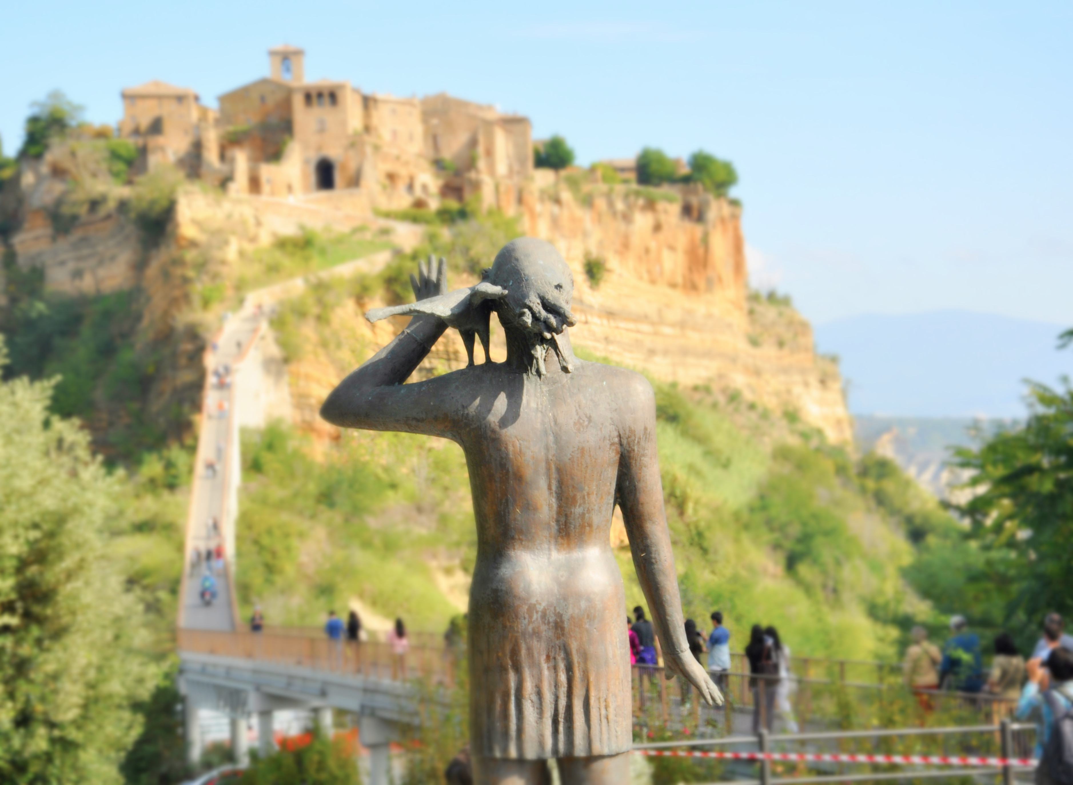 我在一年中最和煦的日子来到这里,从罗马乘大巴车一路向北,两个小时就到了巴尼奥雷焦。穿过小镇,绕下一段依山而建的台阶,放眼望去,我们所有人都忍不住“哇”了出来。眼前的画面用什么语言描绘大概都会显得苍白:周围是低洼的河谷,天空之城就孤傲地矗立在几百米外的山头上,突兀而险峻。建在悬崖之畔的房子看似危卵,不知已在陷落之虞中惴惴了几千几百年。