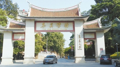 集美学村校门。(福建日报/吴在平 摄)从(福建)厦门岛内乘车,一路向东,行至高集海堤,集美新城便映入眼帘。凭窗望去,一排排红墙绿瓦的高大建筑,鳞次栉比,错落于海天之间,间或亭榭碑塔,掩映于绿树浓荫之中。这里就是华侨领袖陈嘉庚先生的故乡。