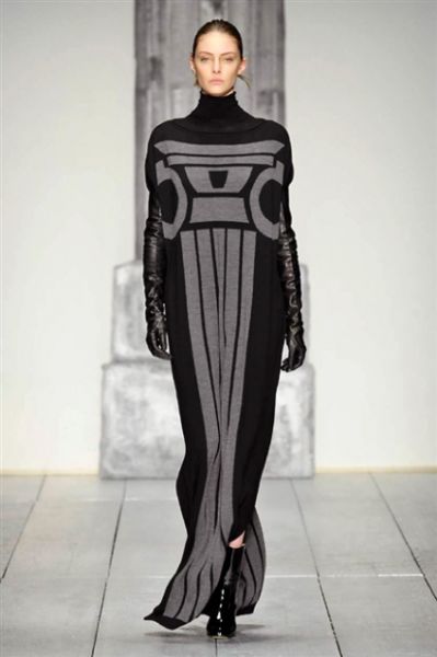 另外,在Angelo Marani品牌的秀台上,新款设计来源意大利著名影星 Sophia Loren的性感装束,大胆使用黑丝袜与复古裙子搭配,布料拼贴、黑色蕾丝与新型填充材料也有大量采用,可以说完美曲线与大屏幕的结合构成了此次Angelo Marani秋冬的美好展示。
