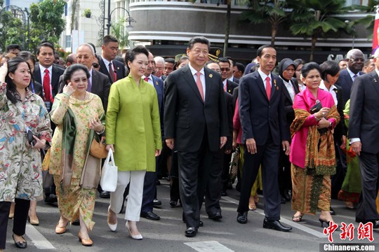 4月24日,国家主席习近平在印度尼西亚万隆出席万隆会议60周年纪念活动。(顾时宏 摄)4月24日,在印度尼西亚参加亚非领导人会议的各国领导人来到万隆,纪念万隆会议召开60周年。中国国家主席习近平和夫人彭丽媛出席纪念活动。