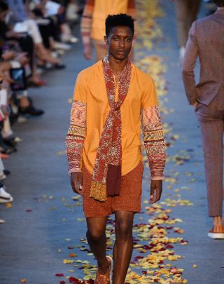 红色,橙色和黄色是温暖的颜色,也正是此次时装周Missoni品牌印花大量使用的颜色,品牌此次减少了标志性线条元素的使用,为格子及其他古怪的奇幻元素腾出了空间。从夹克、衬衫、长裤、短裤,甚至到优雅的套装都无一例外。如多口袋细麂皮夹克视线以及双排扣亚麻色大衣上都加入了许多特色的幻想元素。
