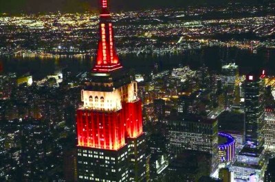 为迎接农历羊年的到来,2月17日、18日,纽约帝国大厦顶部亮起名为《华彩中国》的灯光装置,点亮象征中国的“红—金”彩灯。同时,帝国大厦一楼大厅推出以“三羊(阳)开泰”为主题的橱窗展,将中国人民期盼家庭团圆、生活幸福、万象更新的美好意愿传递给世界。