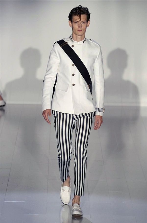 Scervino古驰Gucci在这届男装展上,重新把裤装和夹克袖口上的直线条带到了时尚之巅,连邮差包上面也有这些直线条的身影。值得注意的是,古驰在本次展览上展出的裤装。裤脚卷至脚踝之上,和谐而美观,更让装饰着黄铜挂钩的软皮鞋更加显眼。