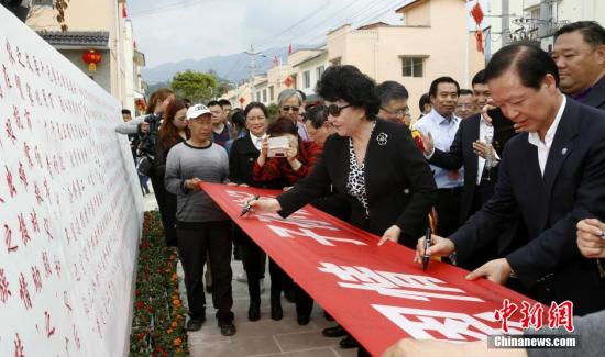 裘援平等40余人在芦山思延乡侨爱新村村民自制的感恩横幅上留下祝福。 中新社记者 刘忠俊 摄
