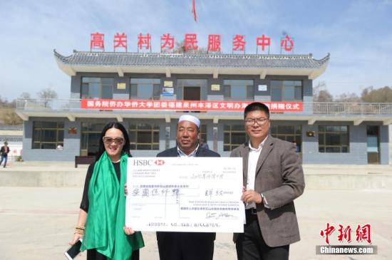 4月11日,国务院侨务办公室副主任王晓萍携手来自英国、新西兰、加拿大、日本、菲律宾等世界各地的20多位侨资企业家来到甘肃积石山县对接扶贫项目。经过一天考察,傍晚的座谈会上,侨商团落实了帮扶项目,还现场捐资超过百万元。 图为英中妇女商会主席张玉霞代表英国华人和英中经济文化促进会向积石山高关村捐赠关爱贫困女生教育善款。杨艳敏 摄在甘肃积石山县胡林家乡卫生院,“侨二代”孙曦看到父母的名字镌刻在墙上,有些动容。这是其父孙福林12年前捐资修建的医院。“我会接力父亲长期帮扶积石山,除提供资金、医疗设备,还将提供技术支持,并愿意为更远山村贫困群众修建卫生院。”他说。