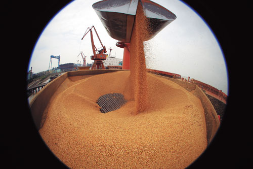 资料图:长三角一家公司正在从外轮上卸运进口大豆。国家农业部近日上午就农业转基因有关情况举行发布会,农业部科技教育司司长廖西元表示,目前,我国批准种植的转基因作物只有棉花和番木瓜,从生产和消费实践看,经过科学家安全评价、政府严格审批的转基因产品是安全的。