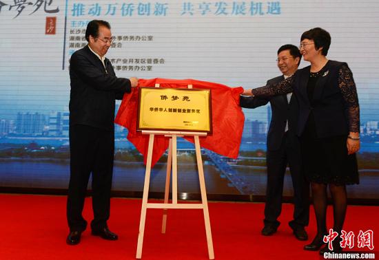 5月23日,国务院侨办副主任王晓萍(右一),湖南省委常委、省委秘书长许又声(左一),长沙市市长胡衡华共同为长沙“侨梦苑”揭牌,来自海内外的侨界代表共300余人见证这一时刻。中新社记者 杨华峰 摄几天前,全国第九个侨商产业聚集区“侨梦苑”在湖南长沙揭牌。此前,由国务院侨办与地方政府联手打造的“侨梦苑”已经落户天津、河北、福建、广东等地,为华侨华人来华圆梦提供了专业平台。