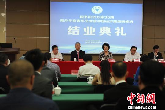 7日,国务院侨办第35期海外华裔青年企业家中国经济高级研修班举行结业仪式。中国国务院侨办主任裘援平出席结业仪式,她寄语现场的海外华裔青年企业家,未来在三个方面要做好“带头人”。