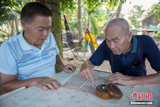 6月14日,海南省琼海市潭门镇草塘村89岁的老船长卢业发正在向他的儿子卢家炳传授更路簿和罗盘的使用方法。中新社记者 骆云飞 摄《更路簿》是海南渔民在开发和经营西、南、中沙群岛的过程中,用海南方言字写成,利用文字和地图的方式描绘出的航海手册。其最早出现在元代,盛行于明末、清代和民国时期,记录了南海海域的100多处地名和重要的海洋资讯。时光流逝,彼时的老船长们正逐渐退出历史,只有《更路簿》记录下他们的南海传奇。(骆云飞)