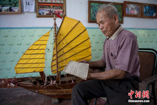 6月14日,海南省琼海市潭门镇草塘村已经耄耋之年的老船长苏承芬在自己手工制作的帆船模型前翻阅祖传的风帆《更路簿》。中新社记者 骆云飞 摄