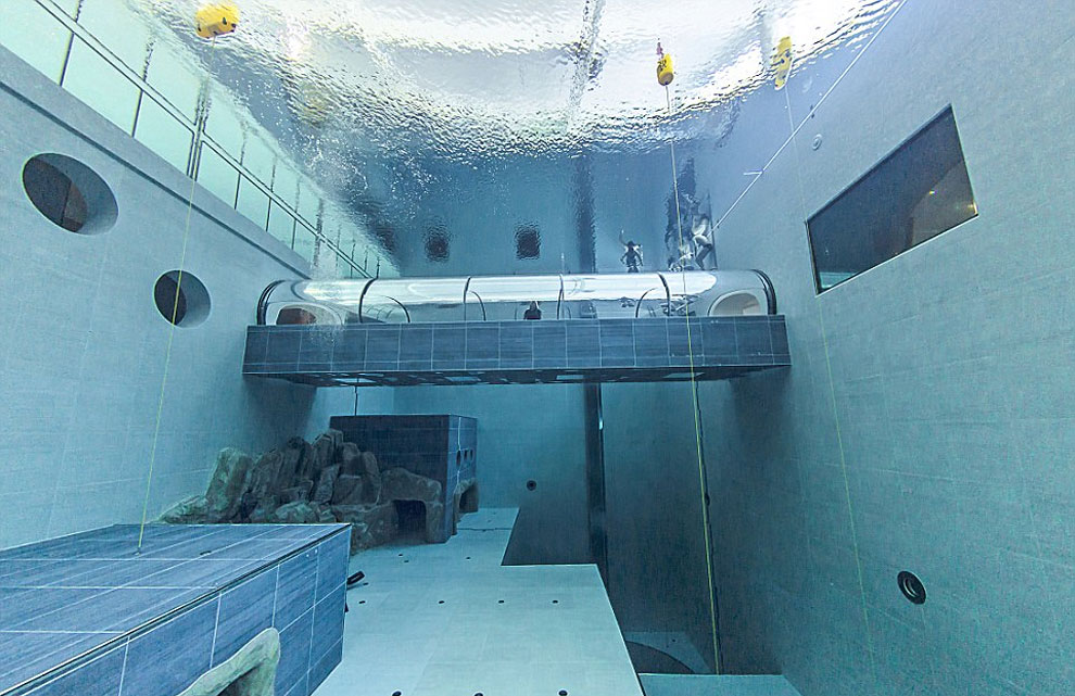 游泳池分为不同的深度区域,既可以满足潜水爱好者在室内深度潜水,也可以满足初学者水下拍照的梦想,自由潜水者更可以在里面体验美人鱼等不同形象,人们还可以从连廊通道中近距离观看潜水者。