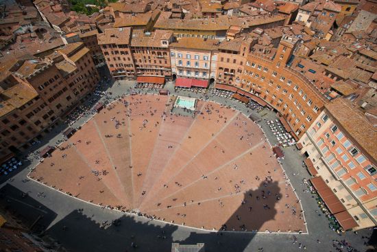 坎波广场(Piazza del Campo)是欧洲最奇特、最美丽的广场之一,依地形而建的广场中间低、四周高,像贝壳的形状。广场用红砖铺砌,用白线分成了九个扇形,这是为了纪念13世纪中到14世纪初期统治锡耶纳并使城市繁荣的旧人组成的城邦政府。
