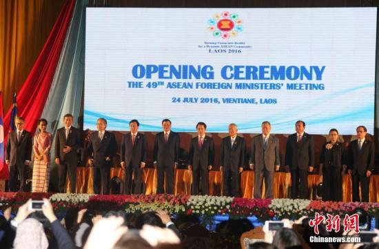 资料图 东盟轮值主席国老挝总理通伦与东盟十国外长及东盟秘书长黎良明在开幕式上合影。中新社记者 张明 摄 中新社万象7月25日电 中国和东盟国家外交部长25日在老挝万象举行会晤,就全面有效落实《南海各方行为宣言》发表联合声明,维护南海的和平与稳定符合中国与东盟国家以及国际社会的基本利益。