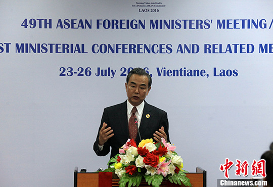 图为王毅在回答记者提问。 中新社记者 张明 摄中新社万象7月25日电 (记者 张明)中国外交部长王毅25日在老挝万象出席中国—东盟外长会议后举行中外媒体吹风会。王毅在回答如何看待有些势力炒作南海仲裁案问题时强调,仲裁案给解决南海争端开出了错误药方,应当退烧降温了。